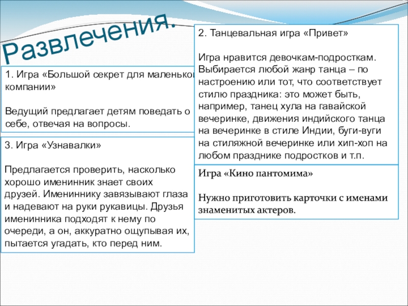Предлагается проверить, насколько хорошо именинник знает своих друзей. Имениннику завязывают глаза и надевают на руки рукавицы. Друзья именинника подходят к нему по очереди, а он, аккуратно ощупывая их, пытается угадать, кто перед ним.