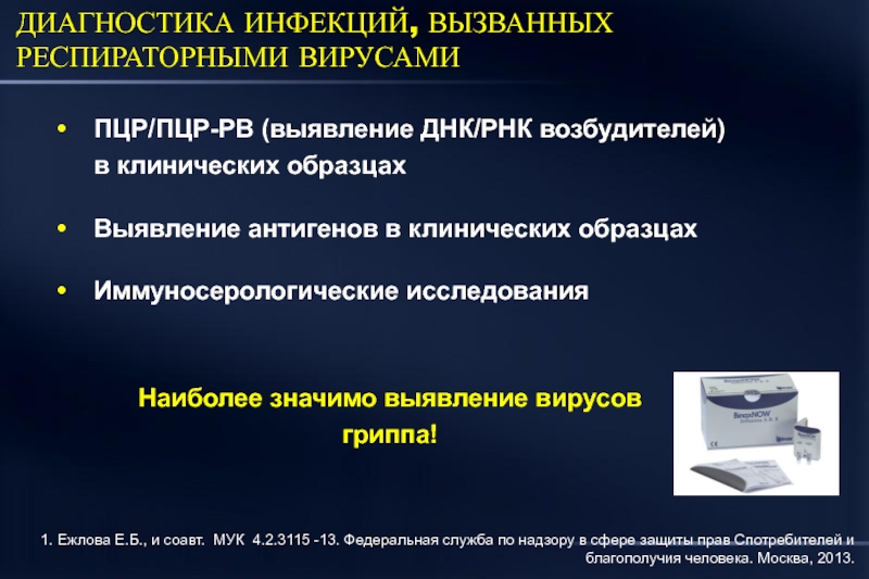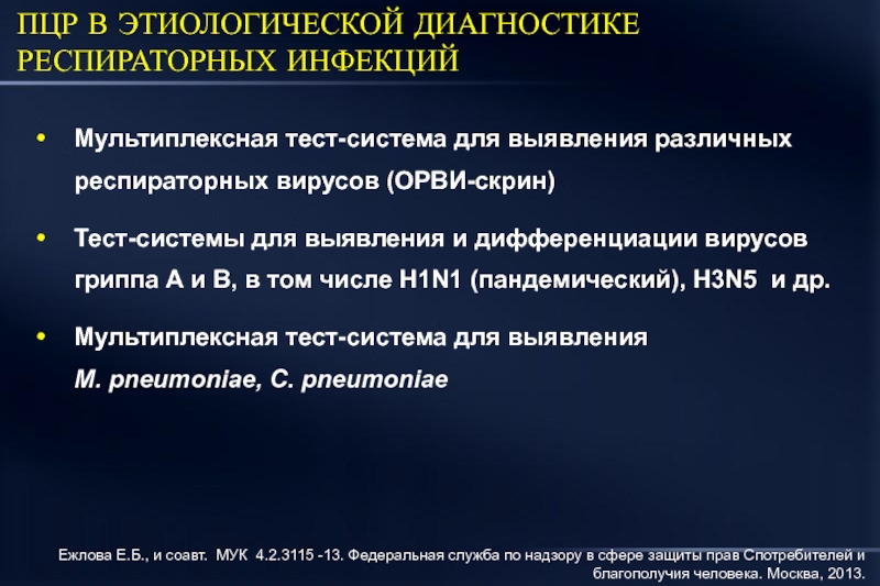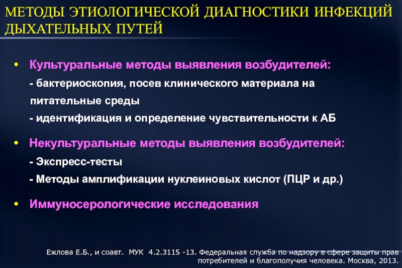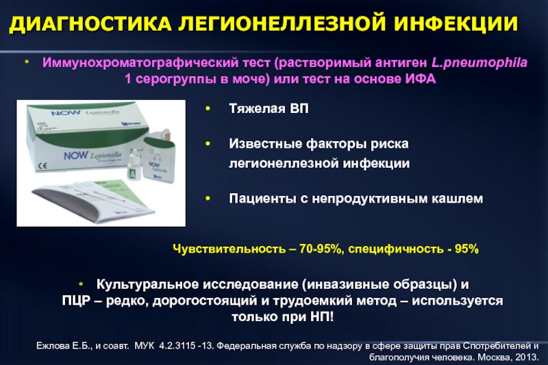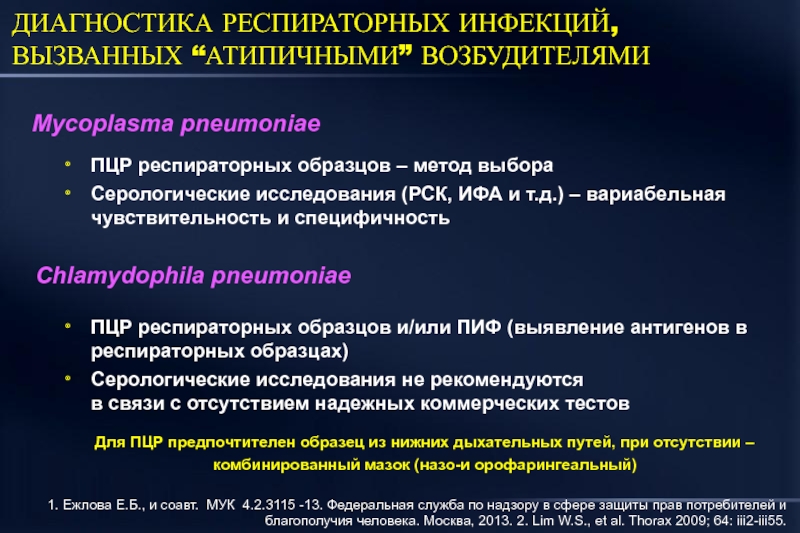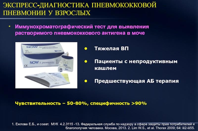 1. Ежлова Е.Б., и соавт. МУК 4.2.3115 -13. Федеральная служба по надзору в сфере защиты прав потребителей и благополучия человека. Москва, 2013. 2. Lim W.S., et al. Thorax 2009; 64: iii2-iii55.