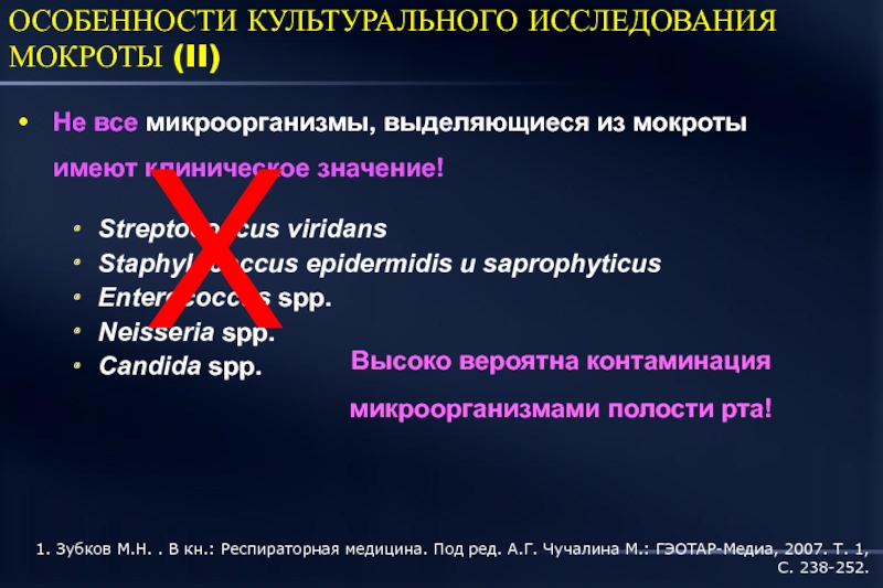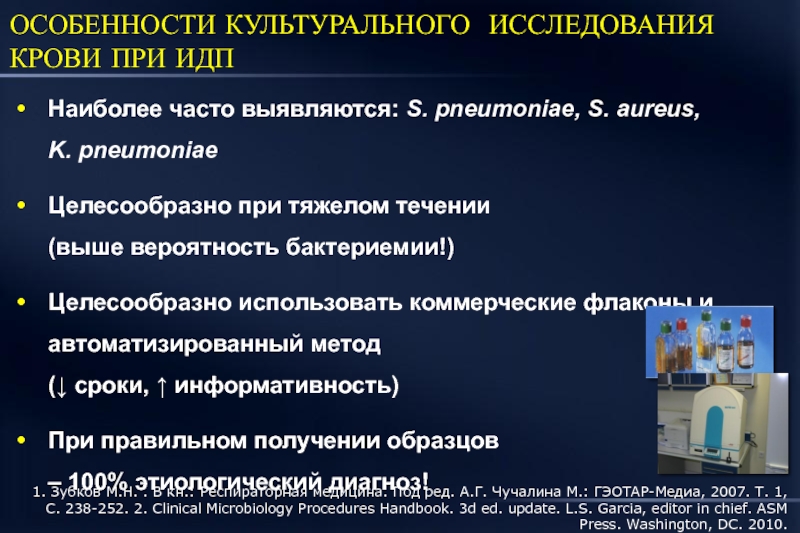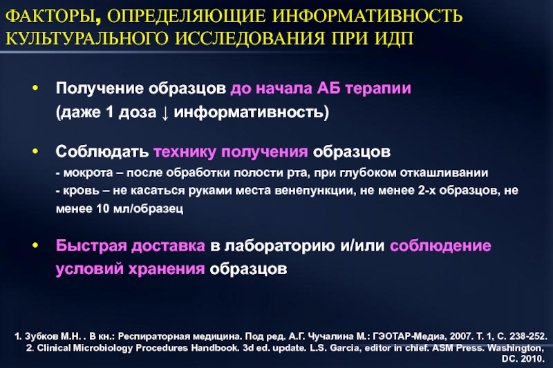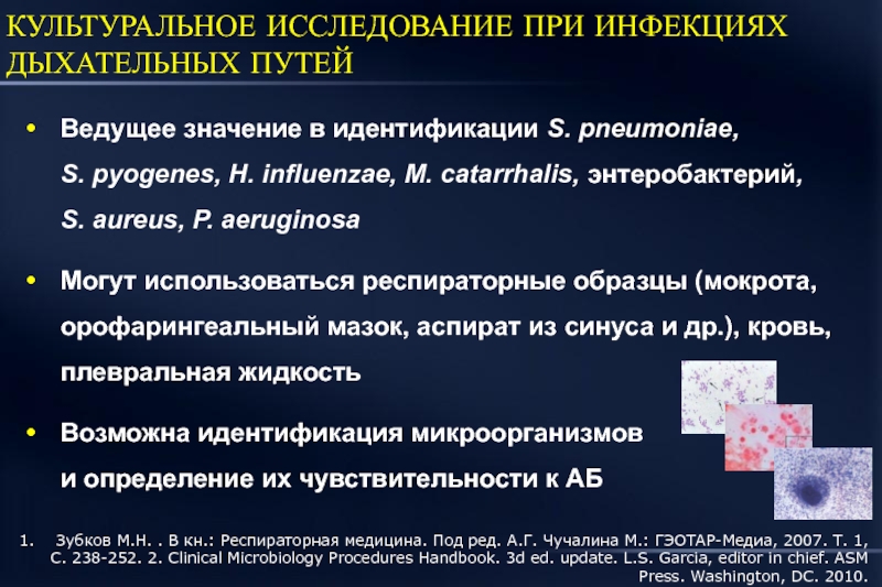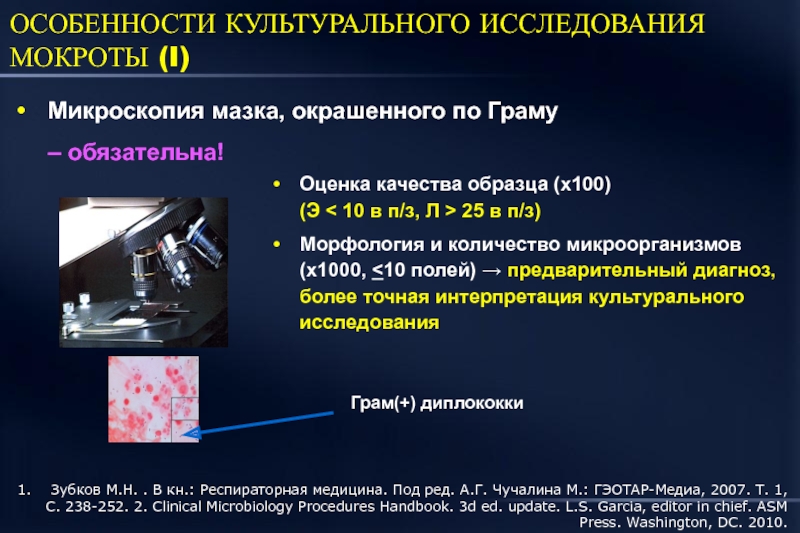 Зубков М.Н. . В кн.: Респираторная медицина. Под ред. А.Г. Чучалина М.: ГЭОТАР-Медиа, 2007. Т. 1, С. 238-252. 2. Clinical Microbiology Procedures Handbook. 3d ed. update. L.S. Garcia, editor in chief. ASM Press. Washington, DC. 2010.