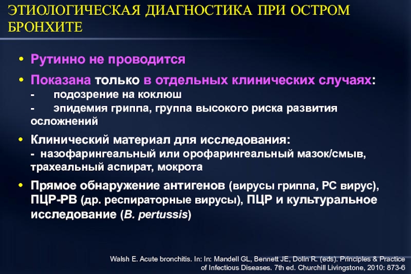Walsh E. Acute bronchitis. In: In: Mandell GL, Bennett JE, Dolin R. (eds). Principles & Practice