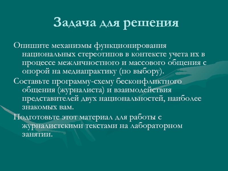 Составьте программу-схему бесконфликтного общения (журналиста) и взаимодействия представителей двух национальностей, наиболее знакомых вам.