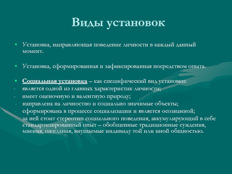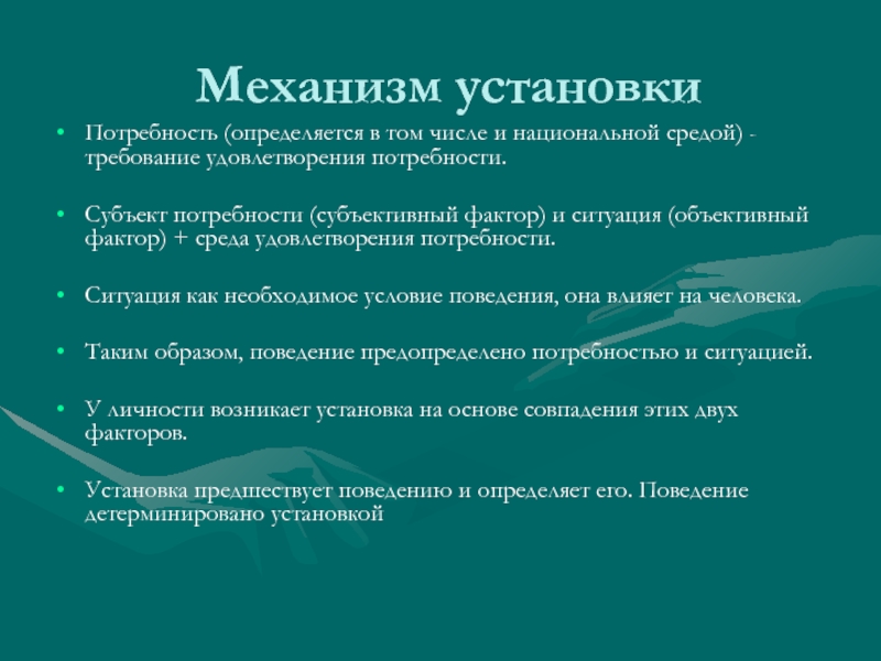 Установка предшествует поведению и определяет его. Поведение детерминировано установкой