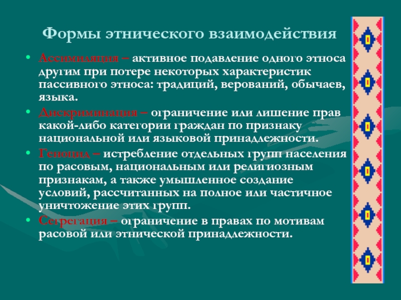 Геноцид – истребление отдельных групп населения по расовым, национальным или религиозным признакам, а также умышленное создание условий, рассчитанных на полное или частичное уничтожение этих групп.