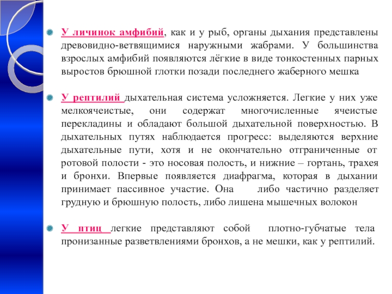 У рептилий дыхательная система усложняется. Легкие у них уже мелкоячеистые, они содержат многочисленные ячеистые перекладины и обладают большой дыхательной поверхностью. В дыхательных путях наблюдается прогресс: выделяются верхние дыхательные пути, хотя и не окончательно отграниченные от ротовой полости - это носовая полость, и нижние – гортань, трахея и бронхи. Впервые появляется диафрагма, которая в дыхании принимает пассивное участие. Она либо частично разделяет грудную и брюшную полость, либо лишена мышечных волокон
