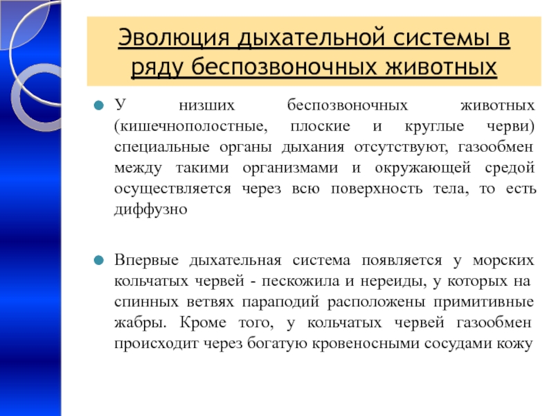 Слайд 19Эволюция дыхательной системы в ряду беспозвоночных животных