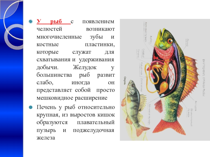 Печень у рыб относительно крупная, из выростов кишок образуются плавательный пузырь и поджелудочная железа