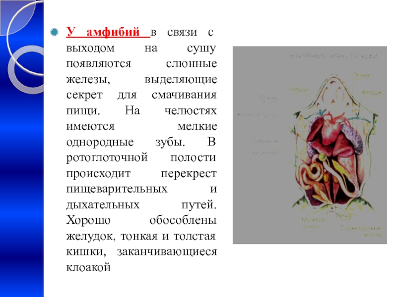 Слайд 14У амфибий в связи с выходом на сушу появляются слюнные