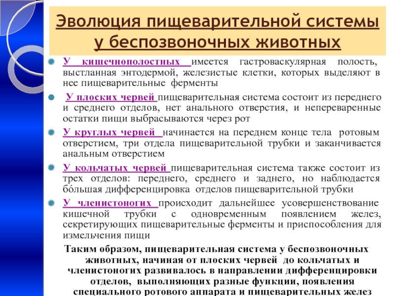 Таким образом, пищеварительная система у беспозвоночных животных, начиная от плоских червей до кольчатых и членистоногих развивалось в направлении дифференцировки отделов, выполняющих разные функции, появления специального ротового аппарата и пищеварительных желез