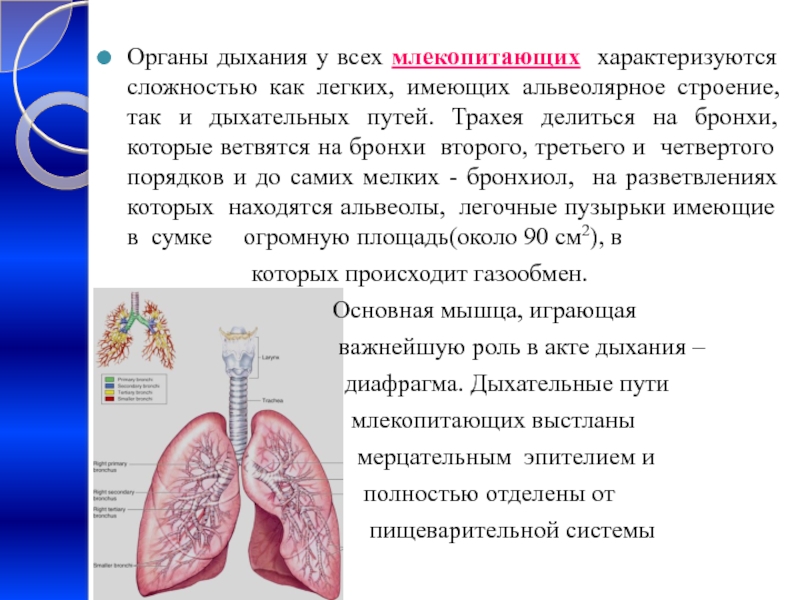 Слайд 24Органы дыхания у всех млекопитающих характеризуются сложностью как легких, имеющих