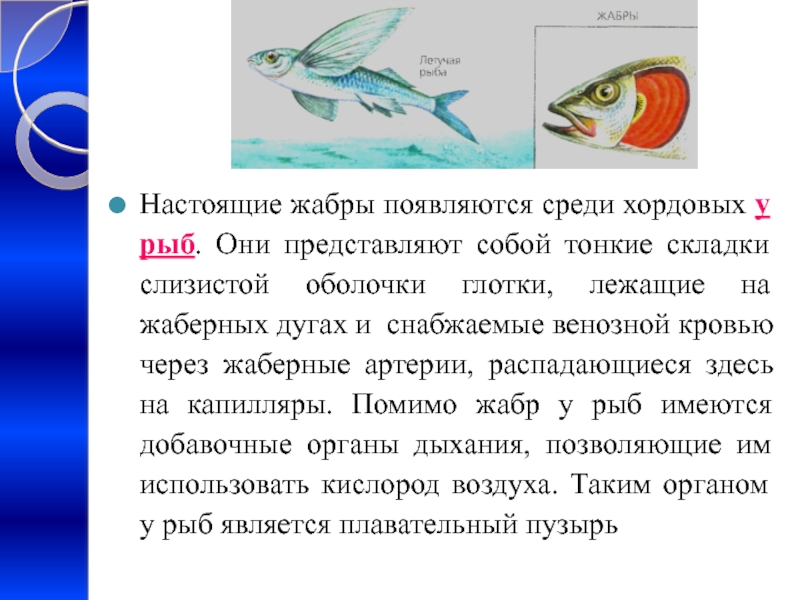 Слайд 22Настоящие жабры появляются среди хордовых у рыб. Они представляют собой