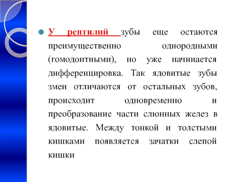 Слайд 15У рептилий зубы еще остаются преимущественно однородными (гомодонтными), но уже