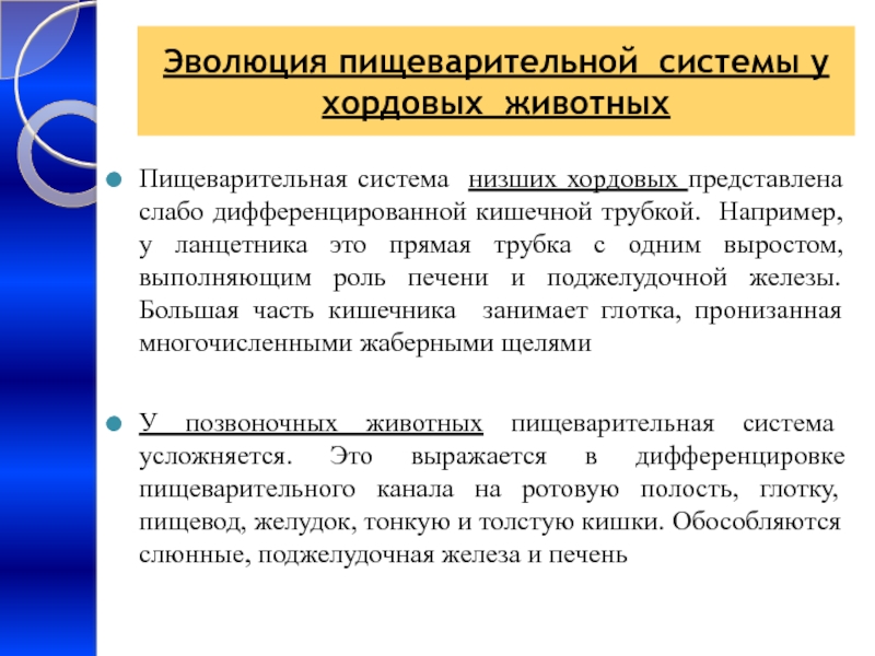 Слайд 12Эволюция пищеварительной системы у хордовых животных