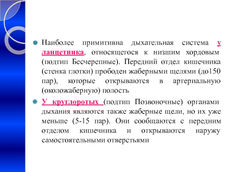 Слайд 21Наиболее примитивна дыхательная система у ланцетника, относящегося к низшим хордовым