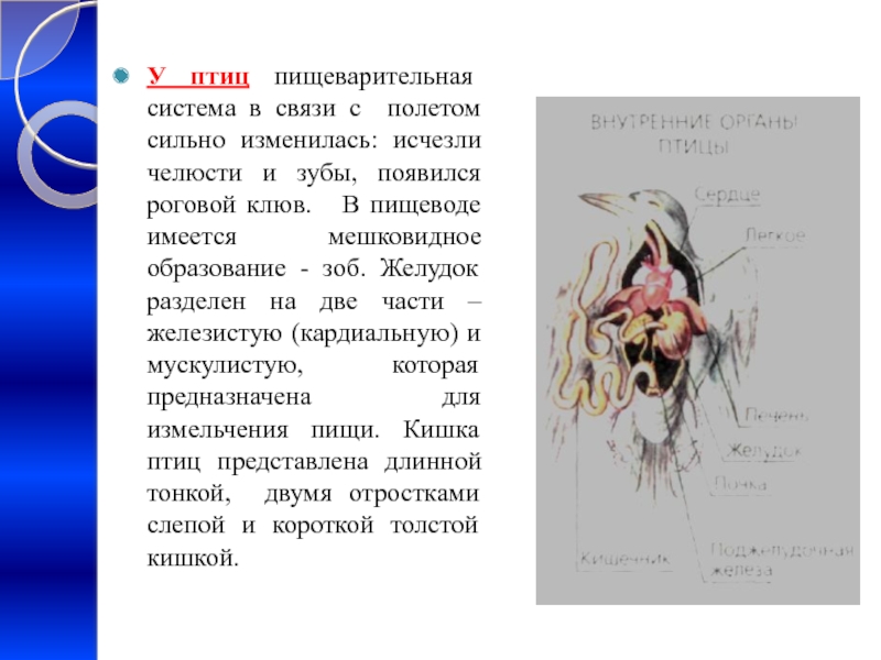 Слайд 16У птиц пищеварительная система в связи с полетом сильно изменилась: