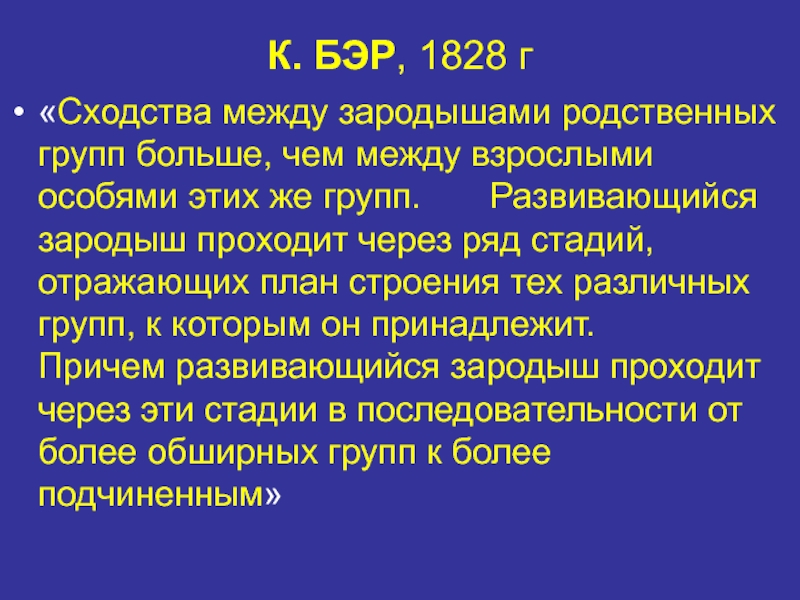 зародыш проходит через ряд стадий, отражающих план строения тех различных групп, к которым он принадлежит. Причем развивающийся зародыш проходит через эти стадии в последовательности от более обширных групп к более подчиненным»
