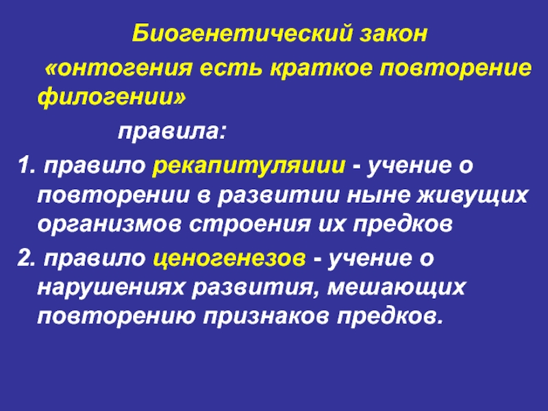 2. правило ценогенезов - учение о нарушениях развития, мешающих повторению признаков предков.