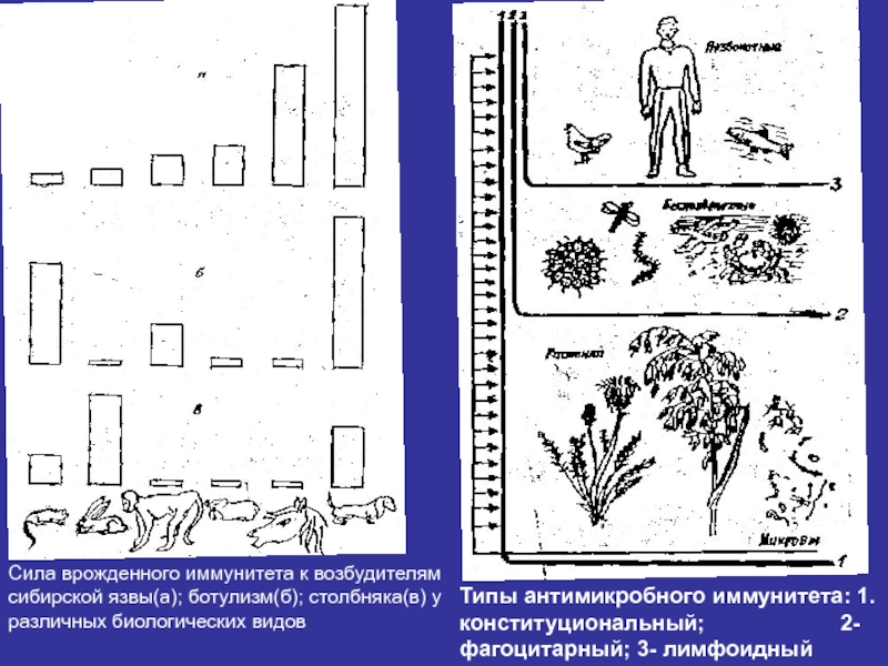 Слайд 6Сила врожденного иммунитета к возбудителям сибирской язвы(а); ботулизм(б); столбняка(в) у