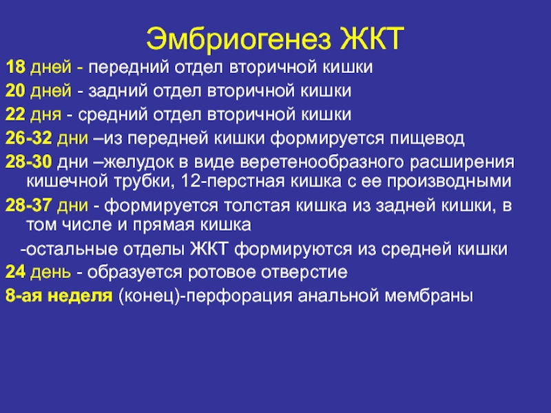 28-30 дни –желудок в виде веретенообразного расширения кишечной трубки, 12-перстная кишка с ее производными