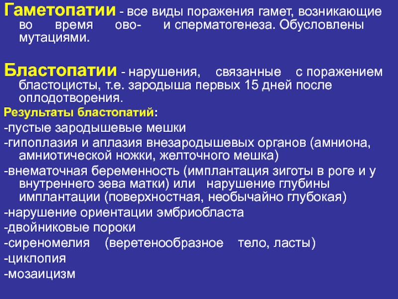 Бластопатии - нарушения, связанные с поражением бластоцисты, т.е. зародыша первых 15 дней после оплодотворения.