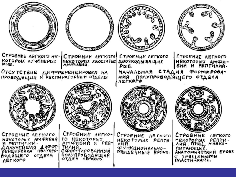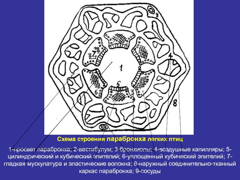 и эластические волокна; 8-наружный соединительно-тканный каркас парабронха; 9-сосуды