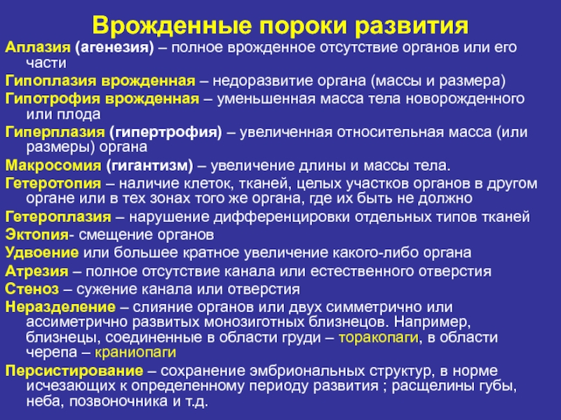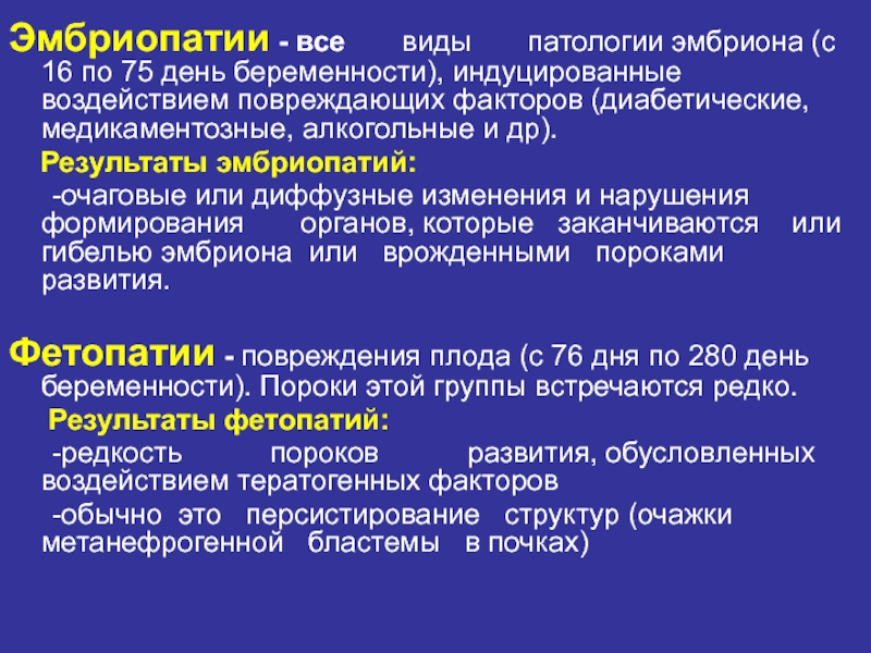 -очаговые или диффузные изменения и нарушения формирования органов, которые заканчиваются или гибелью эмбриона или врожденными пороками развития.