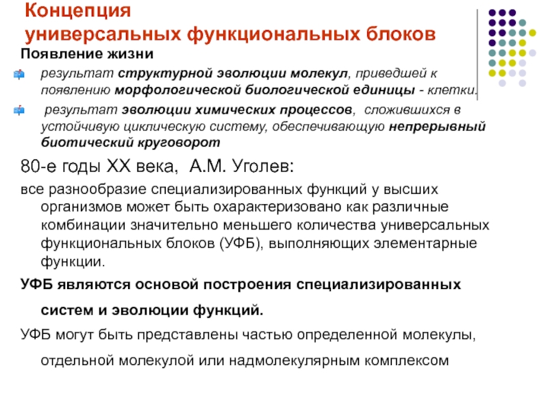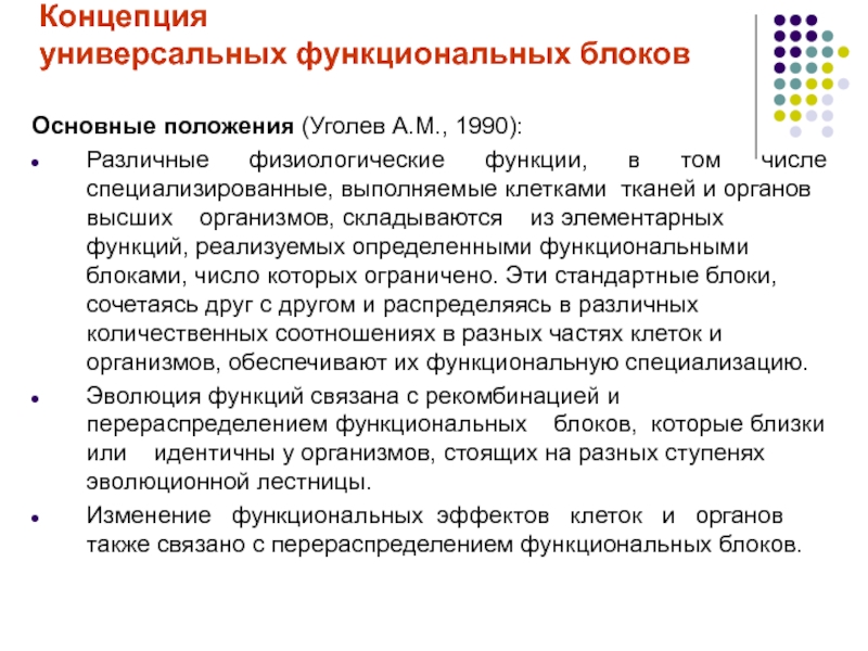 все разнообразие специализированных функций у высших организмов может быть охарактеризовано как различные комбинации значительно меньшего количества универсальных функциональных блоков (УФБ), выполняющих элементарные функции.