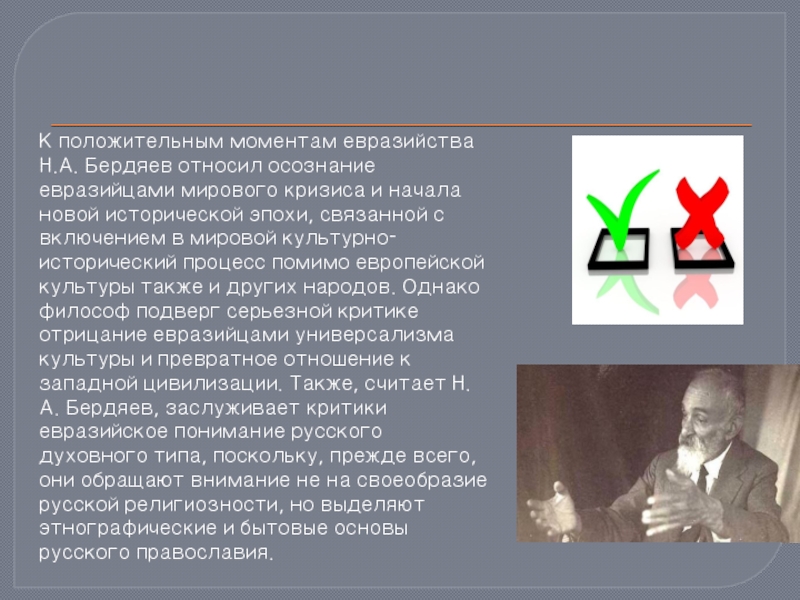 Слайд 15К положительным моментам евразийства Н.А. Бердяев относил осознание евразийцами мирового