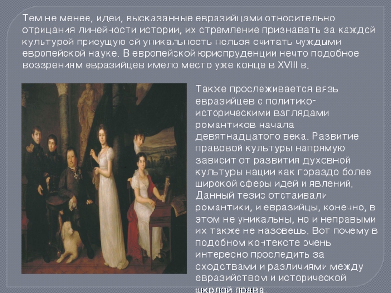 Также прослеживается вязь евразийцев с политико-историческими взглядами романтиков начала девятнадцатого века. Развитие правовой культуры напрямую зависит от развития духовной культуры нации как гораздо более широкой сферы идей и явлений. Данный тезис отстаивали романтики, и евразийцы, конечно, в этом не уникальны, но и неправыми их также не назовешь. Вот почему в подобном контексте очень интересно проследить за сходствами и различиями между евразийством и исторической школой права.