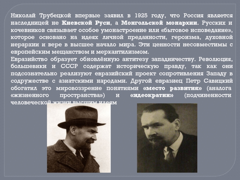 политической культуры Евразии сыграла не Киевская Русь, а кочевая Империя Чингисхана. Также они считали, что евразийское пространство должно быть объединено в единое государственное образование, где ведущую роль играли бы не русские, а содружество славянских и «туранских» народов (финно-угорских, тюркских и т. д.)