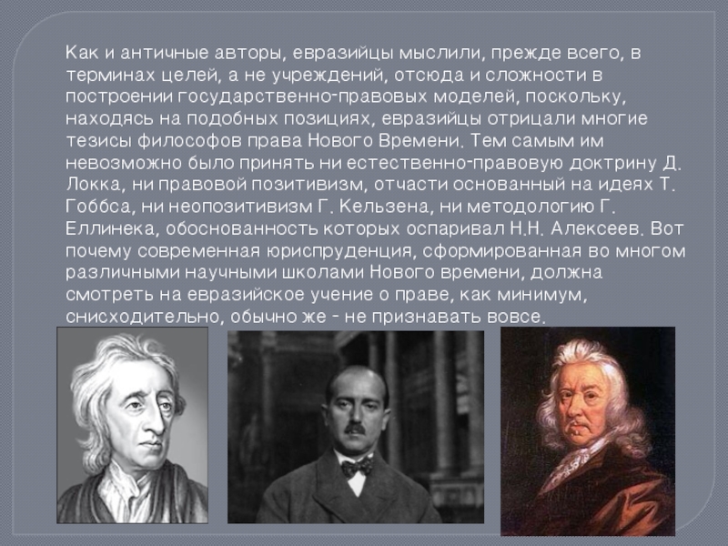 моделей, поскольку, находясь на подобных позициях, евразийцы отрицали многие тезисы философов права Нового Времени. Тем самым им невозможно было принять ни естественно-правовую доктрину Д. Локка, ни правовой позитивизм, отчасти основанный на идеях Т. Гоббса, ни неопозитивизм Г. Кельзена, ни методологию Г. Еллинека, обоснованность которых оспаривал Н.Н. Алексеев. Вот почему современная юриспруденция, сформированная во многом различными научными школами Нового времени, должна смотреть на евразийское учение о праве, как минимум, снисходительно, обычно же – не признавать вовсе.