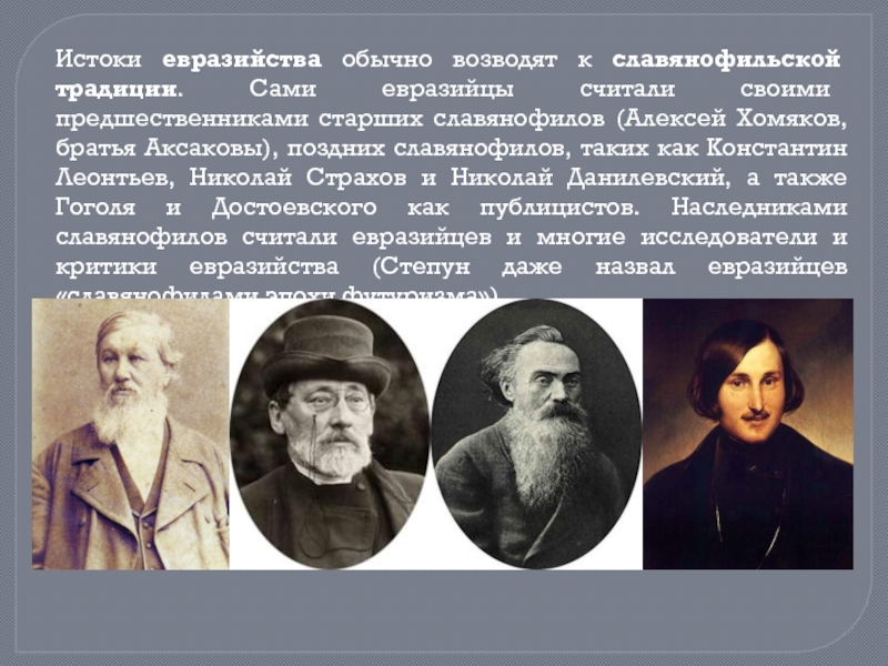 таких как Константин Леонтьев, Николай Страхов и Николай Данилевский, а также Гоголя и Достоевского как публицистов. Наследниками славянофилов считали евразийцев и многие исследователи и критики евразийства (Степун даже назвал евразийцев «славянофилами эпохи футуризма»).