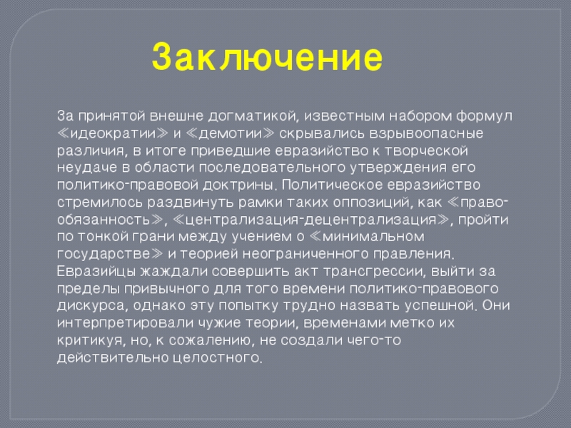 в области последовательного утверждения его политико-правовой доктрины. Политическое евразийство стремилось раздвинуть рамки таких оппозиций, как «право-обязанность», «централизация-децентрализация», пройти по тонкой грани между учением о «минимальном государстве» и теорией неограниченного правления. Евразийцы жаждали совершить акт трансгрессии, выйти за пределы привычного для того времени политико-правового дискурса, однако эту попытку трудно назвать успешной. Они интерпретировали чужие теории, временами метко их критикуя, но, к сожалению, не создали чего-то действительно целостного.