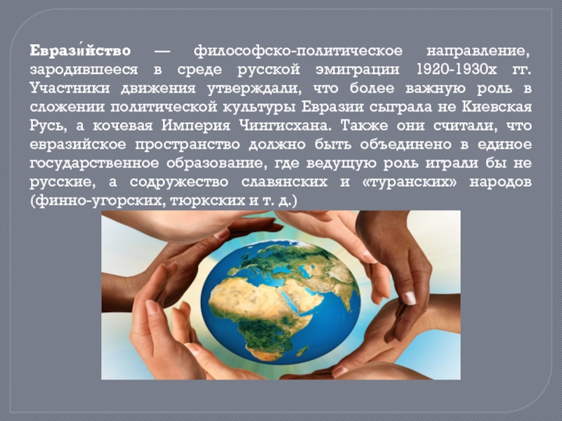 Слайд 2Еврази́йство — философско-политическое направление, зародившееся в среде русской эмиграции 1920-1930х