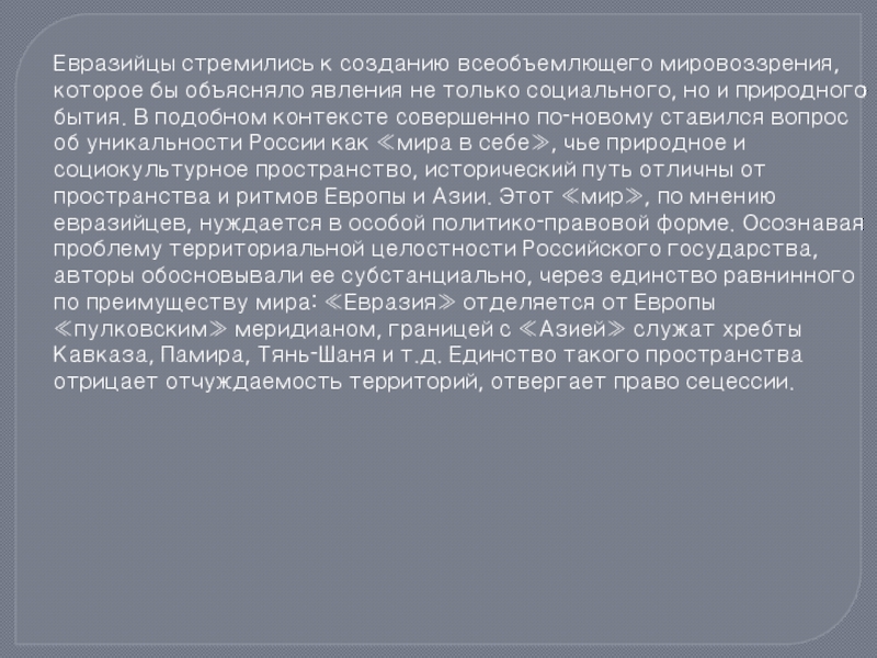 совершенно по-новому ставился вопрос об уникальности России как «мира в себе», чье природное и социокультурное пространство, исторический путь отличны от пространства и ритмов Европы и Азии. Этот «мир», по мнению евразийцев, нуждается в особой политико-правовой форме. Осознавая проблему территориальной целостности Российского государства, авторы обосновывали ее субстанциально, через единство равнинного по преимуществу мира: «Евразия» отделяется от Европы «пулковским» меридианом, границей с «Азией» служат хребты Кавказа, Памира, Тянь-Шаня и т.д. Единство такого пространства отрицает отчуждаемость территорий, отвергает право сецессии.