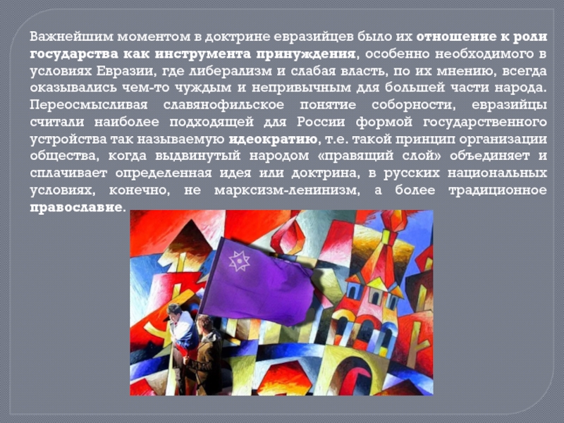 либерализм и слабая власть, по их мнению, всегда оказывались чем-то чуждым и непривычным для большей части народа. Переосмысливая славянофильское понятие соборности, евразийцы считали наиболее подходящей для России формой государственного устройства так называемую идеократию, т.е. такой принцип организации общества, когда выдвинутый народом «правящий слой» объединяет и сплачивает определенная идея или доктрина, в русских национальных условиях, конечно, не марксизм-ленинизм, а более традиционное православие.