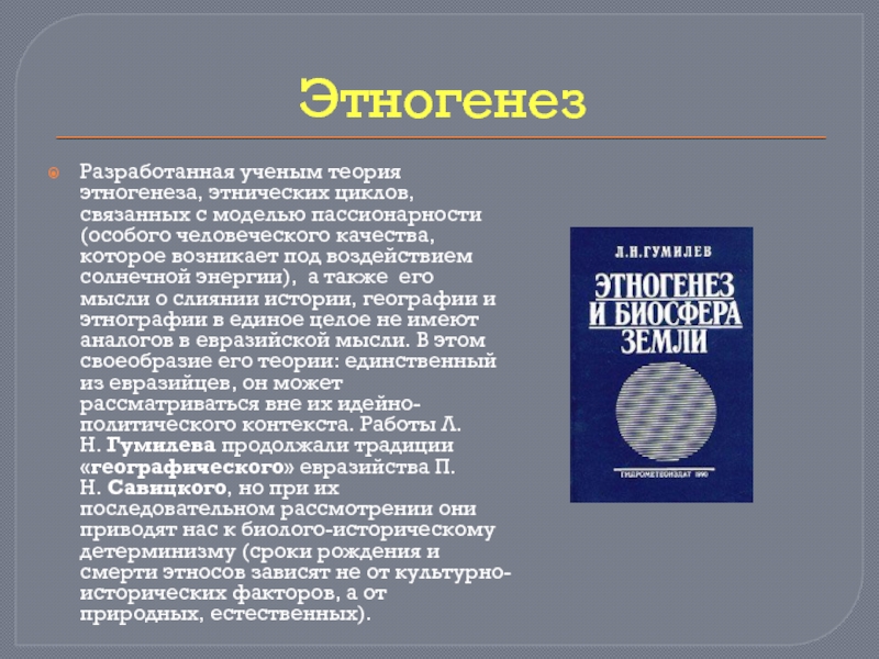 также его мысли о слиянии истории, географии и этнографии в единое целое не имеют аналогов в евразийской мысли. В этом своеобразие его теории: единственный из евразийцев, он может рассматриваться вне их идейно-политического контекста. Работы Л.Н. Гумилева продолжали традиции «географического» евразийства П.Н. Савицкого, но при их последовательном рассмотрении они приводят нас к биолого-историческому детерминизму (сроки рождения и смерти этносов зависят не от культурно-исторических факторов, а от природных, естественных).