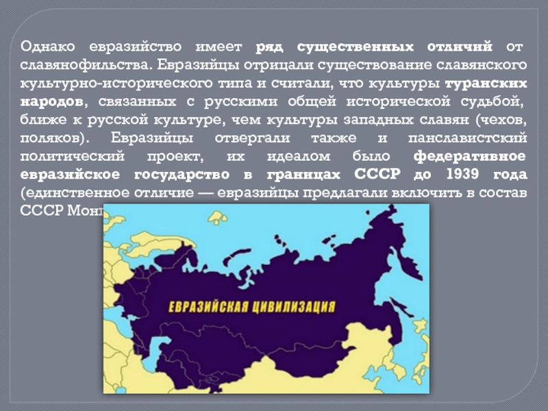 связанных с русскими общей исторической судьбой, ближе к русской культуре, чем культуры западных славян (чехов, поляков). Евразийцы отвергали также и панславистский политический проект, их идеалом было федеративное евразийское государство в границах СССР до 1939 года (единственное отличие — евразийцы предлагали включить в состав СССР Монголию).