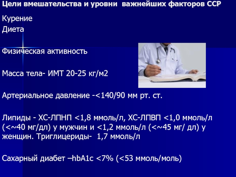 Липиды - ХС-ЛПНП <1,8 ммоль/л, ХС-ЛПВП <1,0 ммоль/л (<~40 мг/дл) у мужчин и <1,2 ммоль/л (<~45 мг/ дл) у женщин. Tриглицериды- 1,7 ммоль/л