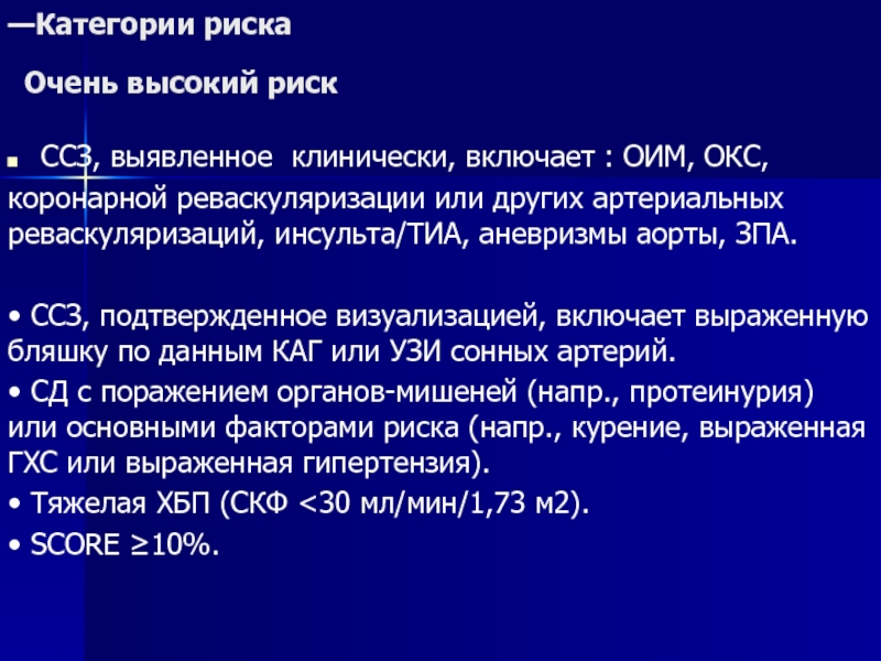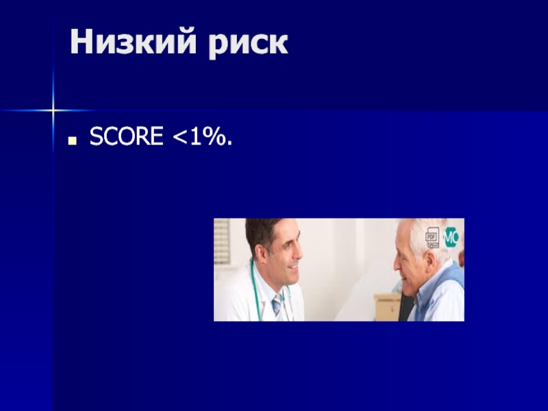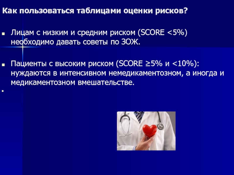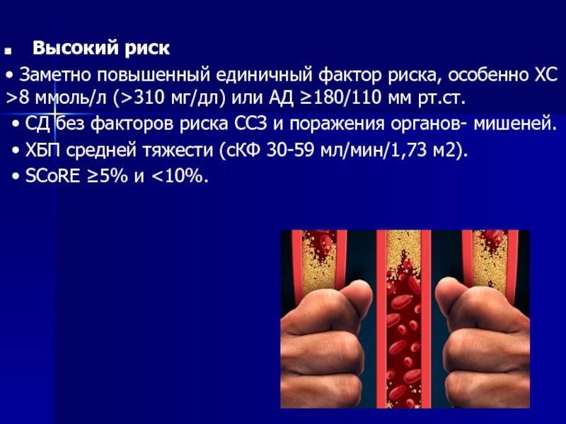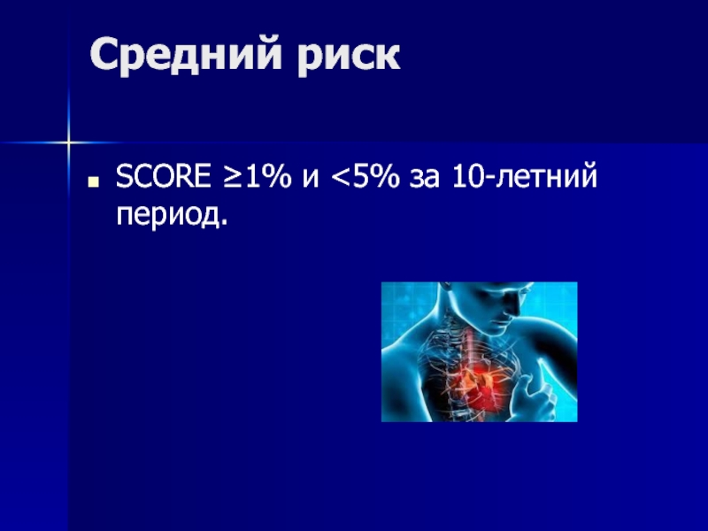 высоким риском (SCORE ≥5% и <10%): нуждаются в интенсивном немедикаментозном, а иногда и медикаментозном вмешательстве.