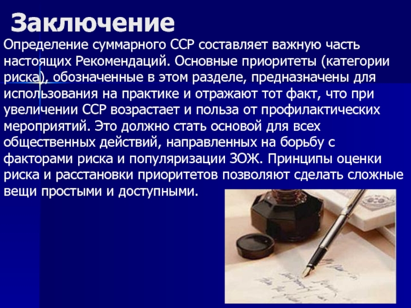 использования на практике и отражают тот факт, что при увеличении ССР возрастает и польза от профилактических мероприятий. Это должно стать основой для всех общественных действий, направленных на борьбу с факторами риска и популяризации ЗОЖ. Принципы оценки риска и расстановки приоритетов позволяют сделать сложные вещи простыми и доступными.
