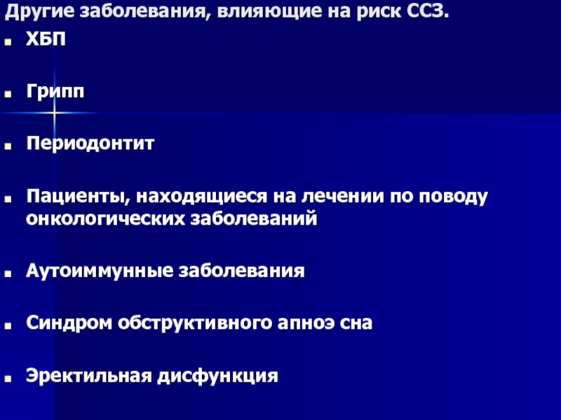 Слайд 16Другие заболевания, влияющие на риск ССЗ.