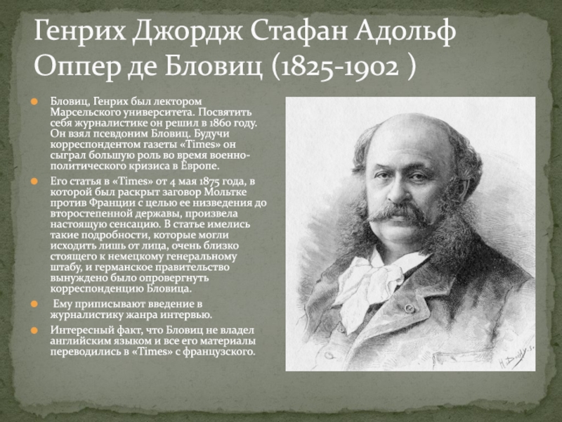 1860 году. Он взял псевдоним Бловиц. Будучи корреспондентом газеты «Times» он сыграл большую роль во время военно-политического кризиса в Европе.