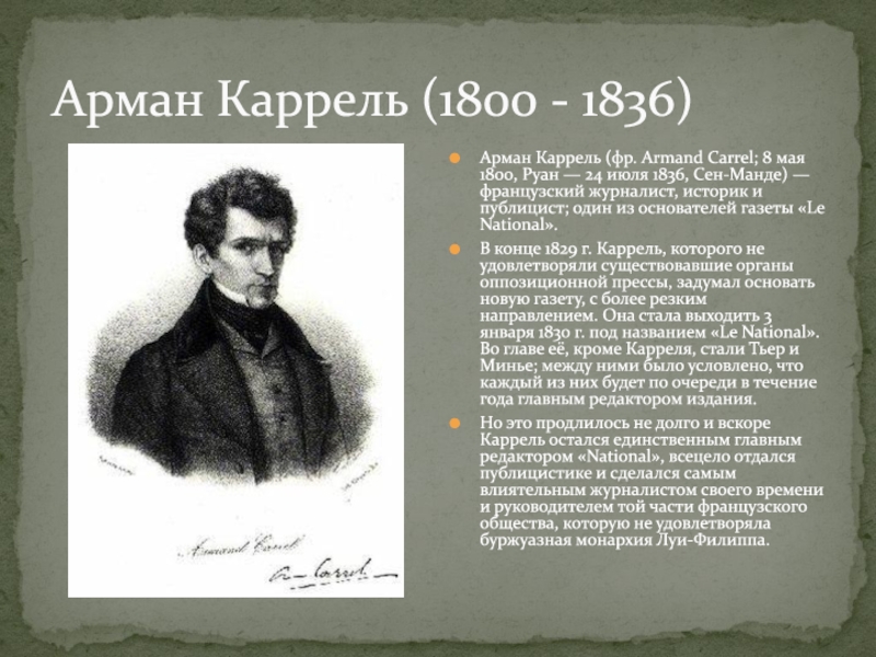 Но это продлилось не долго и вскоре Каррель остался единственным главным редактором «National», всецело отдался публицистике и сделался самым влиятельным журналистом своего времени и руководителем той части французского общества, которую не удовлетворяла буржуазная монархия Луи-Филиппа.