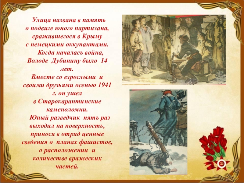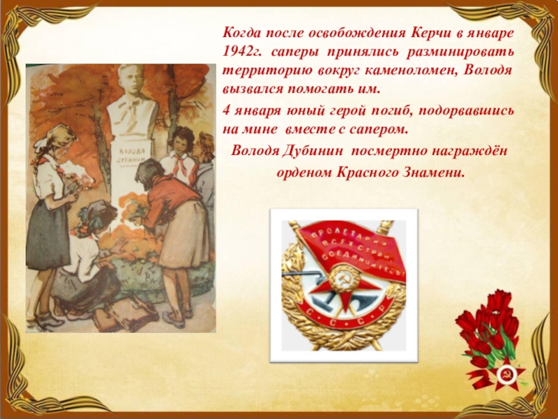 Когда после освобождения Керчи в январе 1942г. саперы принялись разминировать территорию вокруг каменоломен, Володя вызвался помогать им.4