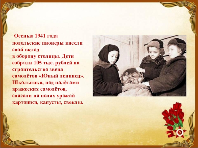 Слайд 4 Осенью 1941 года подольские пионеры внесли свой вклад в