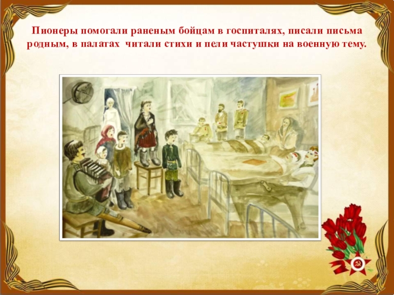 Слайд 5Пионеры помогали раненым бойцам в госпиталях, писали письма родным, в