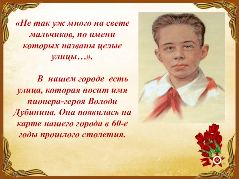 городе есть улица, которая носит имя пионера-героя Володи Дубинина. Она появилась на карте нашего города в 60-е годы прошлого столетия.