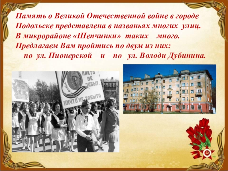 Память о Великой Отечественной войне в городе Подольске представлена в названьях многих улиц.  В микрорайоне «Шепчинки»