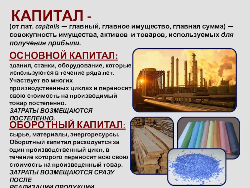 сырье, материалы, энергоресурсы. Оборотный капитал расходуется за один производственный цикл, в течение которого переносит всю свою стоимость на произведенный товар.
