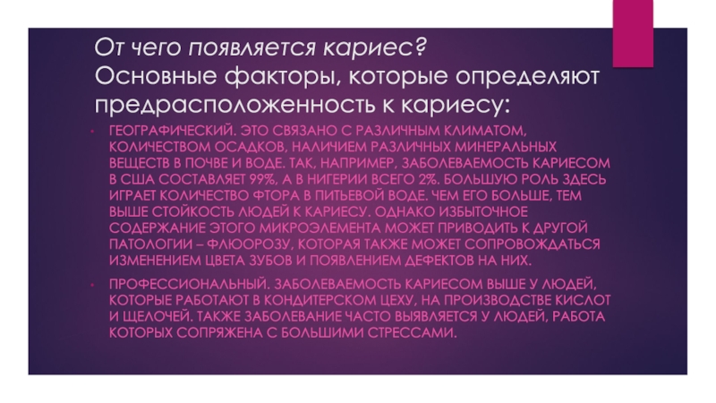 веществ в почве и воде. Так, например, заболеваемость кариесом в США составляет 99%, а в Нигерии всего 2%. Большую роль здесь играет количество фтора в питьевой воде. Чем его больше, тем выше стойкость людей к кариесу. Однако избыточное содержание этого микроэлемента может приводить к другой патологии – флюорозу, которая также может сопровождаться изменением цвета зубов и появлением дефектов на них.
